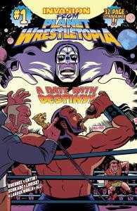 Invasion From Planet Wrestletopia issue 1 is a fun and thrill packed nostalgia fest from the talented writing partnership of Ed Kuehnel and Matt Entin. If those names sound familiar, you might be thinking of the cult horror classic movie Lumberjack Man or video games too numerous to mention.