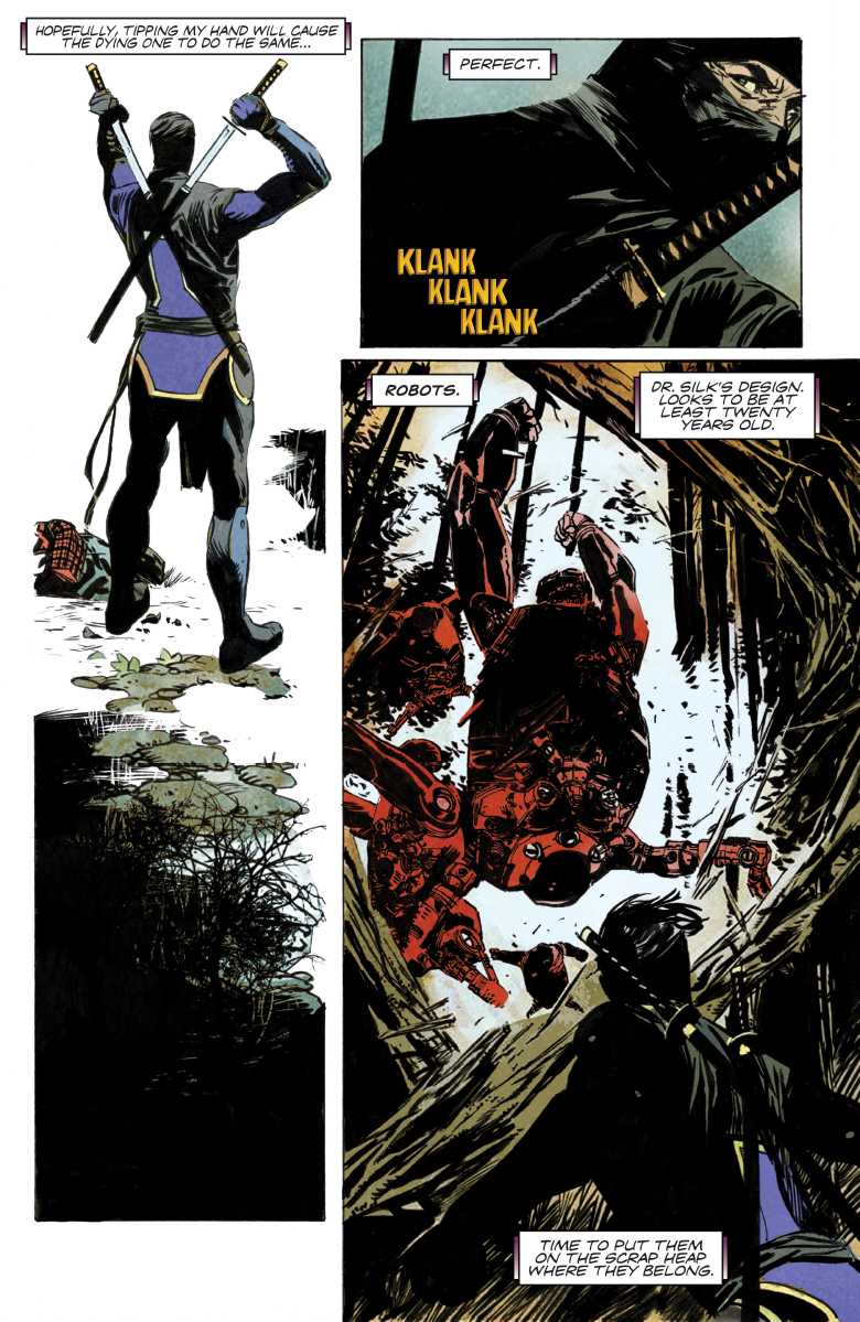 The artwork throughout is fantastic, Robert de la Torre brings a truly visceral quality to the sword play, you can appreciate the effort, and skill of a master swordsman as our protagonist is, through each panel. My favourite panel has to be the revelation of the clockwork men, as sword meets flesh instead of metal and there’s some truly gory finer details in the panel which shows de la Torre’s skill and love of his craft. I found the images particularly chilling and reminiscent of some of the early horror comics I grew up with. Whilst talking of imagery, credit is also due to Jose Villarrubia, aside from some excellent colour work throughout, I love how NINJA-K blends into the panels, and yet we are drawn to him in each scene he remains the focal point and both the art and colours lend themselves well to exactly how the reader expects a ninja to be!