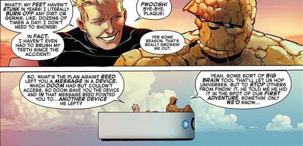 Ben and Johnny are finally on an adventure together, just like the old days, in search of the device Reed has left them to possibly help find the lost Richards family. The two find themselves battling creatures on Monster Island, but Johnny’s power seems to be a real issue for him, leading Doctor Doom to save the two and become the new ruler of the island! The search for the item continues, leading them to a the college from Reed, Ben and Victor’s past…
