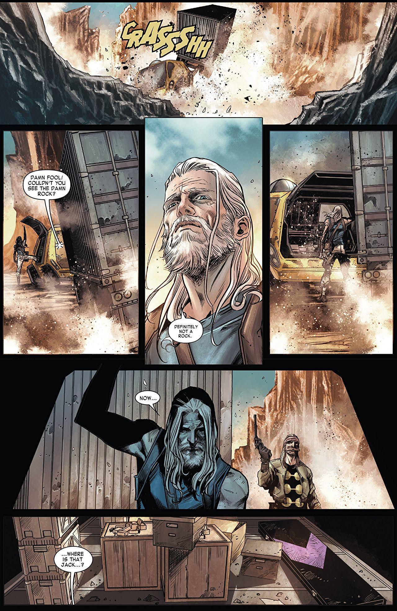 The art from Marco Checchetto and Andres Mossa is stunning and perfectly complements the gritty violence and wasteland from the Old Man Logan universe. The opening action sequence is so well drawn with arrows, bullets and blood flying everywhere! The detail brought to every page is absolutely amazing and each of the characters are so well drawn. The splash panels are particularly impressive, especially the flashback of Clint holding the body of a dying Black Widow. I’ve got to give a shout out to colorist Andres Mossa who brings a wonderful grainy washed out fade to the panels.