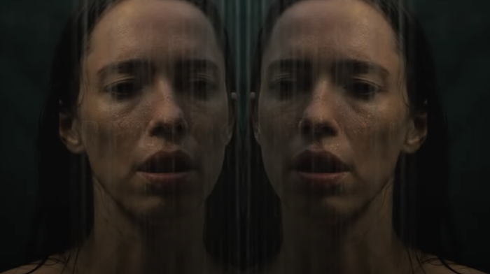 Bruckner excellently builds tension throughout, with a heightened sense of dread and atmosphere permeating the expansive but desolate house and surrounding woods and lake. The fear of the unknown, paired with a sinister sense of being completely and unexpectedly alone, cleverly plays on our core fears. Composer Ben Lovett’s unsettling score also adds to the creepy atmosphere, with one particular jump scare linked to a particularly loud soundscape. Elisha Christian’s stylish cinematography, paired with Kathrin Eder’s stunning production design, furthers the central mystery with repeating imagery of endless glass windows featuring reflections of mirror images, reversed architectural blueprints, and lucid nightmares featuring doors to dark moments in time.