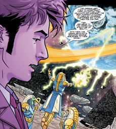 The art in this volume was also fantastic; I particularly enjoyed the illustrations of the black pyramid travelling along the galaxy as it very much reminded me of the monolith in 2001: A Space Odyssey. I also really liked all of the ancient Egyptian designs, particularly the image of an Osirian seemingly moving pyramids with lightning strikes (see below). Kudos to the artists; the details of the tenth doctor are incredible, I am very impressed with how much the illustrations resemble and embody David Tennant as the Doctor!